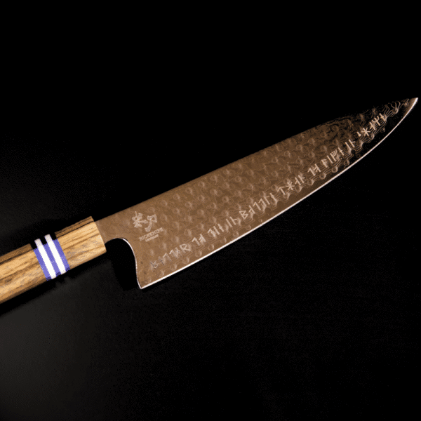 Bladets 2,5 mm tykkelse og 48 mm bredde sikrer præcis snit og skærearbejde, uanset om det er finhakning af grøntsager eller præcis udskæring af kød. Med en imponerende hårdhed på HRC 62+2 (Rockwell) forbliver dette blad skarpt og klar til enhver udfordring. Det japansk ottekantede håndtag i Zebra Wood + Blue/White G10-materiale giver ikke kun et sikkert greb, men tilføjer også en subtil elegance til knivens udseende.