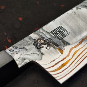 Klingen blev slebet langt tyndere end planlagt, helt ud til grænsen af, hvad stålet kunne bære, og derefter syreætset, indtil et nyt mønster viste sig. Resultatet blev en klinge defineret af overlevelse og genfødsel: let, elegant og kombineret med et tekstureret egetræshåndtag.